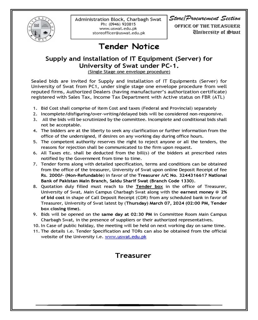 Supply and installation of IT Equipment (Server) for University of Swat under PC-1