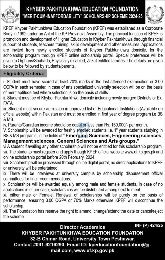 Click here to apply KPEF Scholarship Deadline Extended! Great news! The KPEF Scholarship 2024-25 deadline is now Feb 27, 2025. Don’t miss this chance! Apply now at www.ef.kp.gov.pk In case of any issue with online apply consult Junaid Saib, IT KPEF 0332 9090414