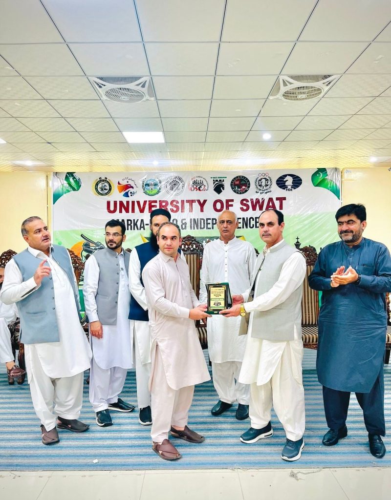 The closing ceremony of University of Swat “Marka-e-Haq & Independence Day Cricket and Chess Championship, 2025 was inaugurated by Vice Chancellor Professor Dr. Hassan Sher University of Swat, alongside Registrar Mr. Fayyaz Ahmad Khan, Director Admissions Mr. Fida Hussain Khan, HOD’s and other staff members, Omer Khan, General Secretary, Chess Federation of Pakistan, Mohammad Salman Khan, Vice President, KP Chess Association, Kashif Salim, General Secretary, KP Chess Association, and Muhammad Waqar, Rating and Development Officer, Chess Federation of Pakistan. At the the end of closing ceremony chief guest Prof Dr, Hassan Sher, VC university of Swat distributed trophies and certificates among the participants.