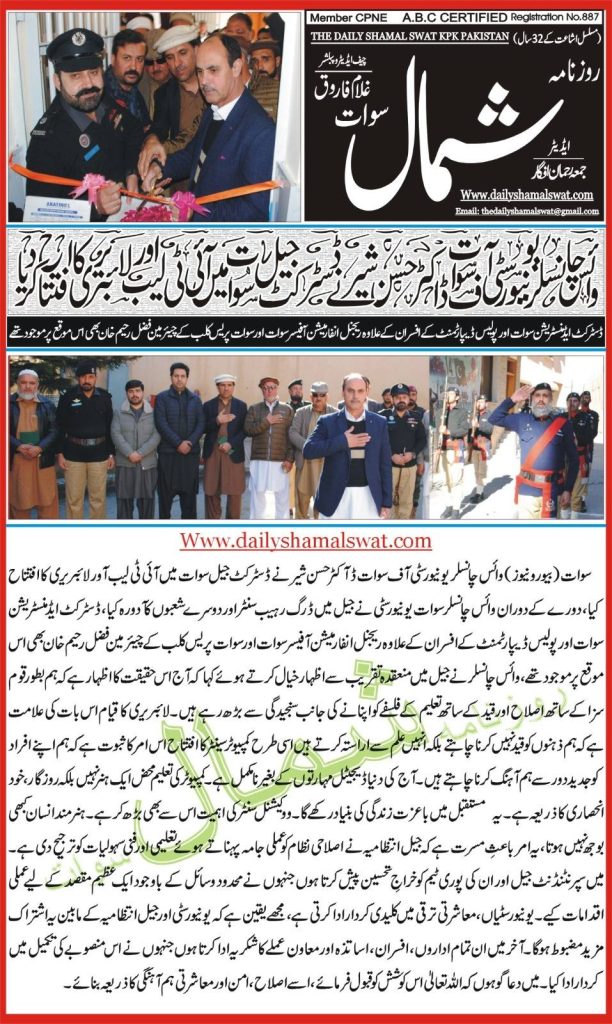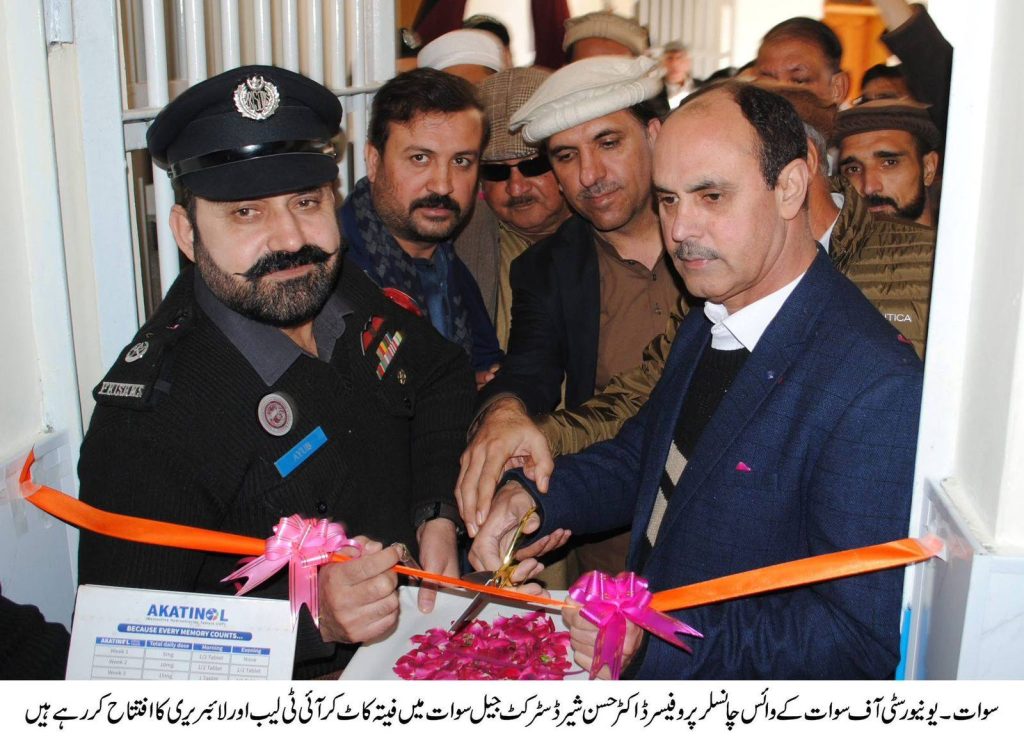 ڈسٹرکٹ جیل سوات میں جیل اصلاحات کے حوالے سے ایک باضابطہ افتتاحی تقریب منعقد ہوئی، جس میں جووینائل بحالی اسکول اور ڈرگ ریہیبلیٹیشن سینٹر کے علاوہ لائبریری، کمپیوٹر لیب، آئی ٹی روم، الیکٹریکل ووکیشنل سینٹر، پلمبنگ ووکیشنل سینٹر اور خواتین سیکشن میں ووکیشنل ٹریننگ سینٹر کا باقاعدہ افتتاح کیا گیا۔